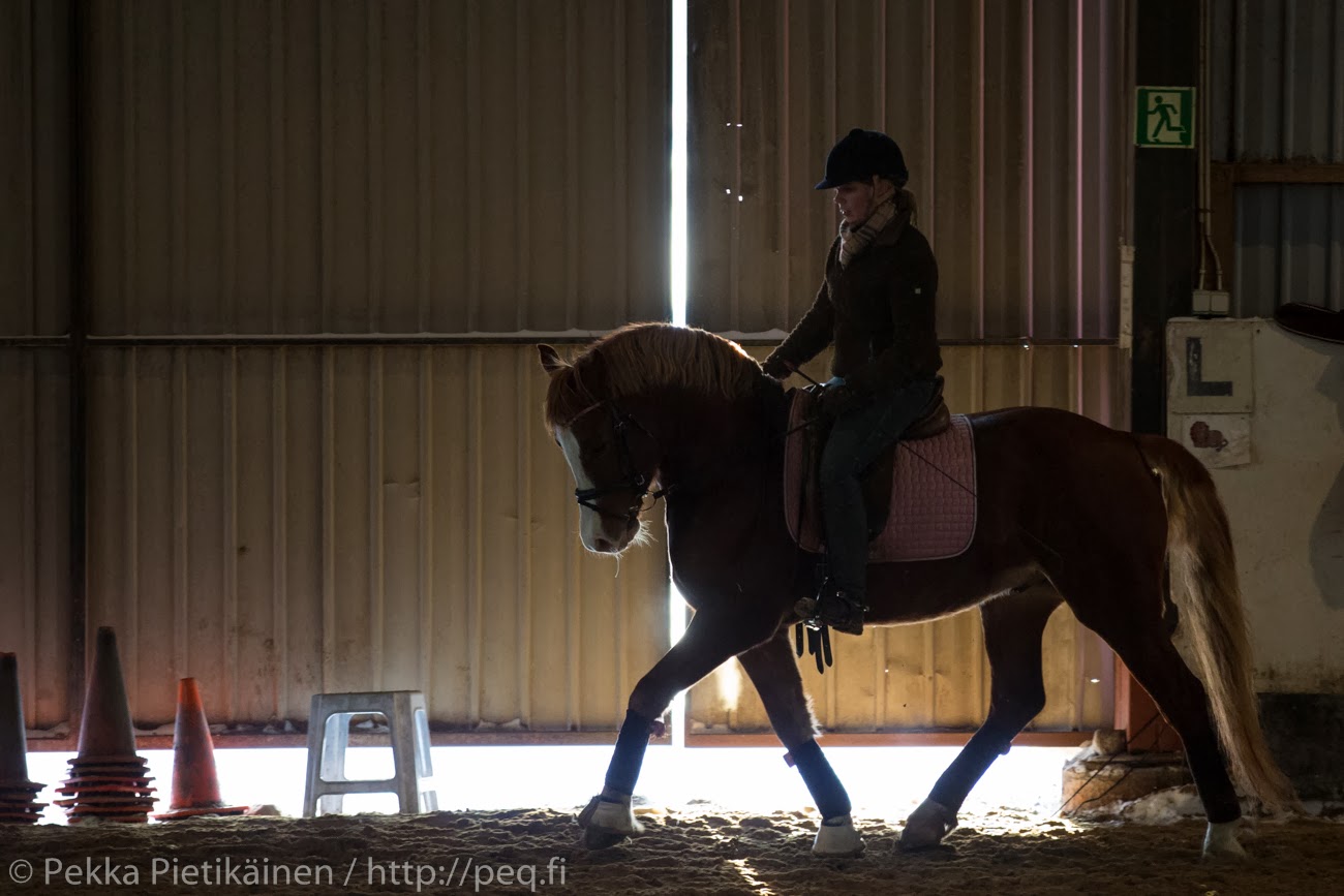 Myöhemmin illalla ratsastin Murden. Silloin pohja oli jo jäätynyt hieman turhan kovaksi, mutta hölkkäiltiin kuitenkin jonkun verran. Jälleen kerran Murde tuntui ihan superhyvältä. Olen nyt muutaman viimeisen kerran mennyt sillä ilman kepukkaa ja se on silti tehnyt mitä pyydetään, kerrassaan hämmentävää. :) Se tuntui sopivan energiseltä ja liikkui kivasti jalasta eteen. Mitään varsinaista haipakkaa ei nyt annetulla pohjalla voinutkaan mennä, mutta sen mitä pyysin, Murde pötki menemään. Tehtiin vähän käyntiväistöjä, siirtymisiä ja ravissa vähän taivuteltiinkin. Kummallekin taisi jäädä hyvä mieli tästä hömpöttelysessiosta. Oli myös kiva huomata, kuinka rennon oloinen Murde oli ja se olisi kulkenut ihan minkälaisessa asennossa tahansa kevyenä ja mukavana. On kerrassaan hämmentävää, kuinka tuo hevonen on nyt vaan jatkuvasti aika kiva ratsastaa eikä alkuunkaan niin hidas ja kammottava kuin mitä se on ollut. Selkeästi nyt ollaan vähän löydetty toisiamme ja opittu lukemaan toisiamme paremmin. Kunhan nyt vielä taas pohjat paranee ja päästään reenaamaan vähän enemmän, voi Murdesta vielä tulla ihan kivakin ratsu! :)